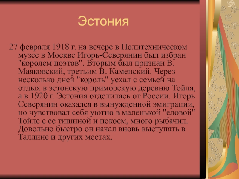 Игорь-Северянин был избран "королем поэтов". Вторым был признан В. Маяковский, третьим В. Каменский. Через несколько дней "король" уехал с семьей на отдых в эстонскую приморскую деревню Тойла, а в 1920 г. Эстония отделилась от России. Игорь Северянин оказался в вынужденной эмиграции, но чувствовал себя уютно в маленькой "еловой" Тойле с ее тишиной и покоем, много рыбачил. Довольно быстро он начал вновь выступать в Таллине и других местах.