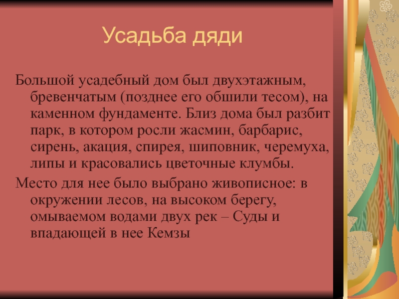 Большой усадебный дом был двухэтажным, бревенчатым (позднее его обшили тесом),