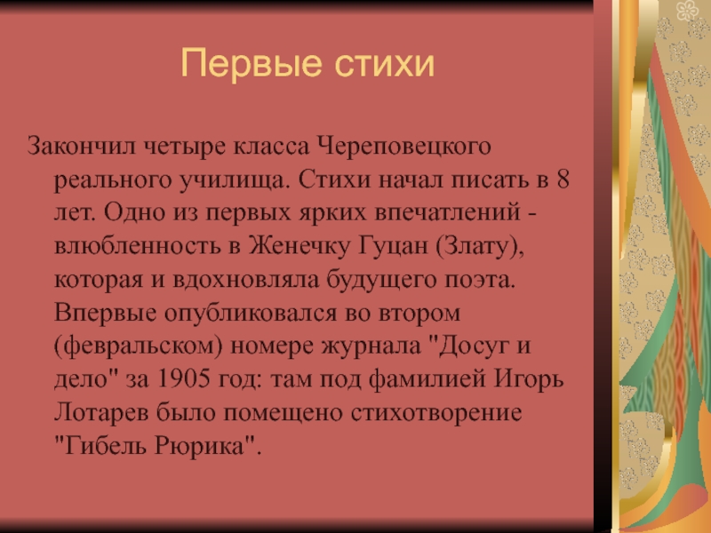 8 лет. Одно из первых ярких впечатлений - влюбленность в Женечку Гуцан (Злату), которая и вдохновляла будущего поэта. Впервые опубликовался во втором (февральском) номере журнала "Досуг и дело" за 1905 год: там под фамилией Игорь Лотарев было помещено стихотворение "Гибель Рюрика".