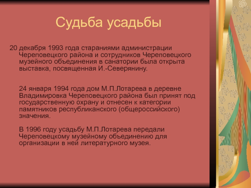В 1996 году усадьбу М.П.Лотарева передали Череповецкому музейному объединению для организации в ней литературного музея.