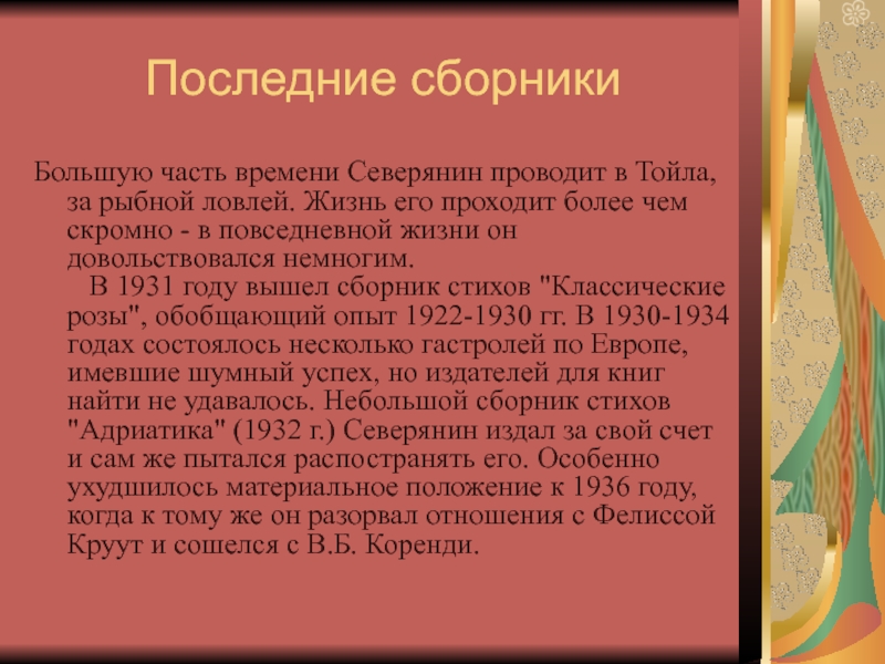 В 1931 году вышел сборник стихов "Классические розы", обобщающий опыт 1922-1930 гг. В 1930-1934 годах состоялось несколько гастролей по Европе, имевшие шумный успех, но издателей для книг найти не удавалось. Небольшой сборник стихов "Адриатика" (1932 г.) Северянин издал за свой счет и сам же пытался распостранять его. Особенно ухудшилось материальное положение к 1936 году, когда к тому же он разорвал отношения с Фелиссой Круут и сошелся с В.Б. Коренди.