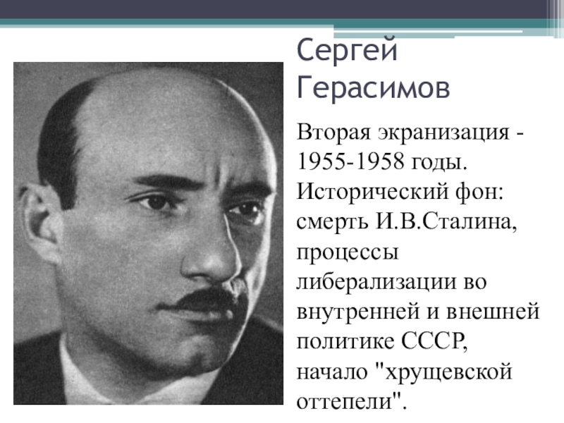 Вторая экранизация - 1955-1958 годы. Исторический фон: смерть И.В.Сталина, процессы