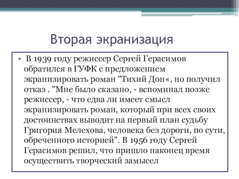 Герасимов обратился в ГУФК с предложением экранизировать роман "Тихий Дон«, но получил отказ . "Мне было сказано, - вспоминал позже режиссер, - что едва ли имеет смысл экранизировать роман, который при всех своих достоинствах выводит на первый план судьбу Григория Мелехова, человека без дороги, по сути, обреченного историей". В 1956 году Сергей Герасимов решил, что пришло наконец время осуществить творческий замысел