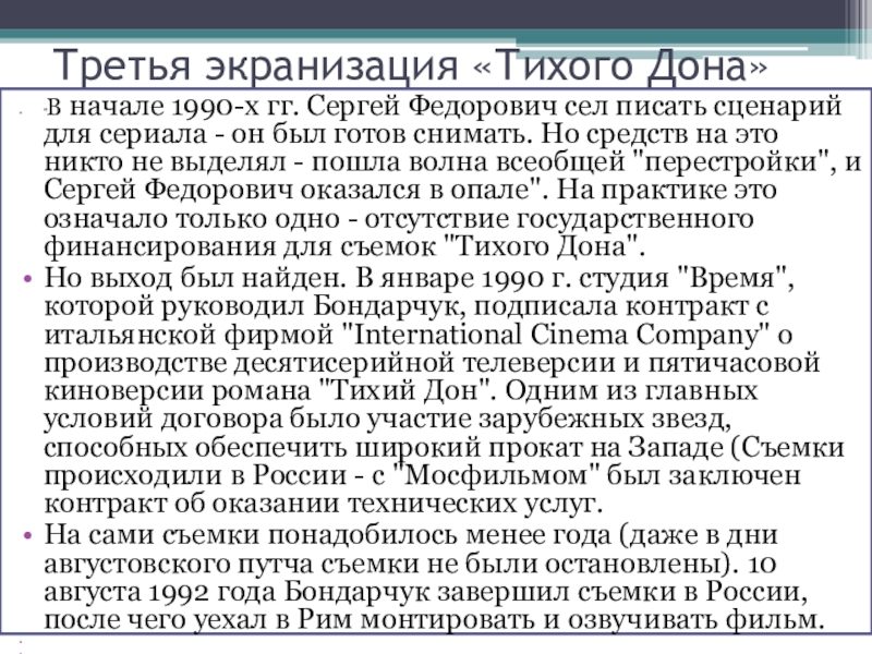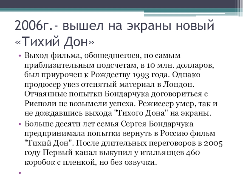 приблизительным подсчетам, в 10 млн. долларов, был приурочен к Рождеству 1993 года. Однако продюсер увез отснятый материал в Лондон. Отчаянные попытки Бондарчука договориться с Рисполи не возымели успеха. Режиссер умер, так и не дождавшись выхода "Тихого Дона" на экраны.