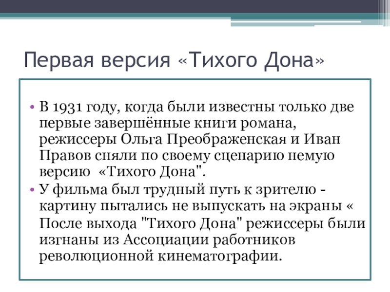 первые завершённые книги романа, режиссеры Ольга Преображенская и Иван Правов сняли по своему сценарию немую версию «Тихого Дона".