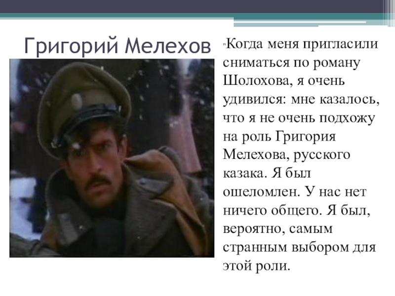 удивился: мне казалось, что я не очень подхожу на роль Григория Мелехова, русского казака. Я был ошеломлен. У нас нет ничего общего. Я был, вероятно, самым странным выбором для этой роли.