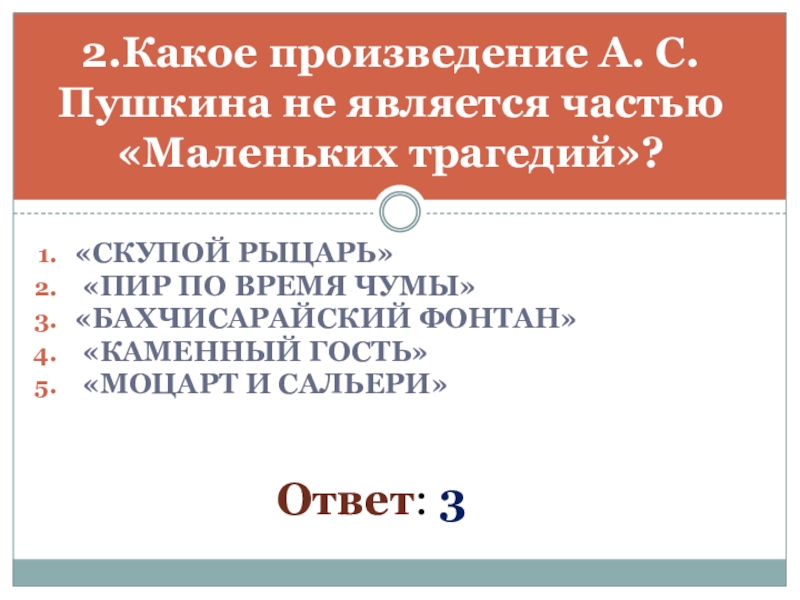 2.Какое произведение А. С. Пушкина не является частью «Маленьких трагедий»?