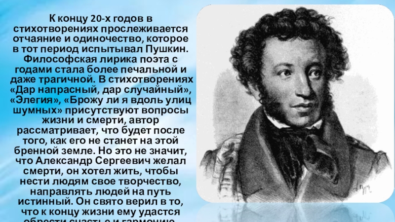 в тот период испытывал Пушкин. Философская лирика поэта с годами стала более печальной и даже трагичной. В стихотворениях «Дар напрасный, дар случайный», «Элегия», «Брожу ли я вдоль улиц шумных» присутствуют вопросы жизни и смерти, автор рассматривает, что будет после того, как его не станет на этой бренной земле. Но это не значит, что Александр Сергеевич желал смерти, он хотел жить, чтобы нести людям свое творчество, направлять людей на путь истинный. Он свято верил в то, что к концу жизни ему удастся обрести счастье и гармонию.