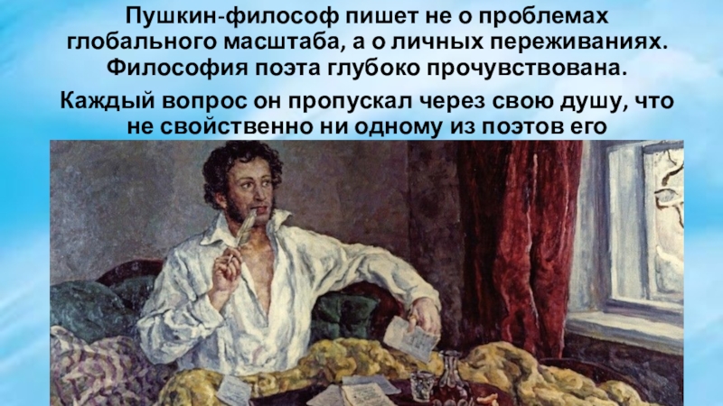 Слайд 4Пушкин-философ пишет не о проблемах глобального масштаба, а о личных переживаниях.
