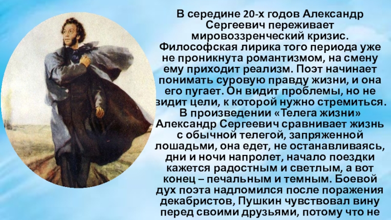 того периода уже не проникнута романтизмом, на смену ему приходит реализм. Поэт начинает понимать суровую правду жизни, и она его пугает. Он видит проблемы, но не видит цели, к которой нужно стремиться. В произведении «Телега жизни» Александр Сергеевич сравнивает жизнь с обычной телегой, запряженной лошадьми, она едет, не останавливаясь, дни и ночи напролет, начало поездки кажется радостным и светлым, а вот конец – печальным и темным. Боевой дух поэта надломился после поражения декабристов, Пушкин чувствовал вину перед своими друзьями, потому что не смог принять участие в восстании против царского режима.