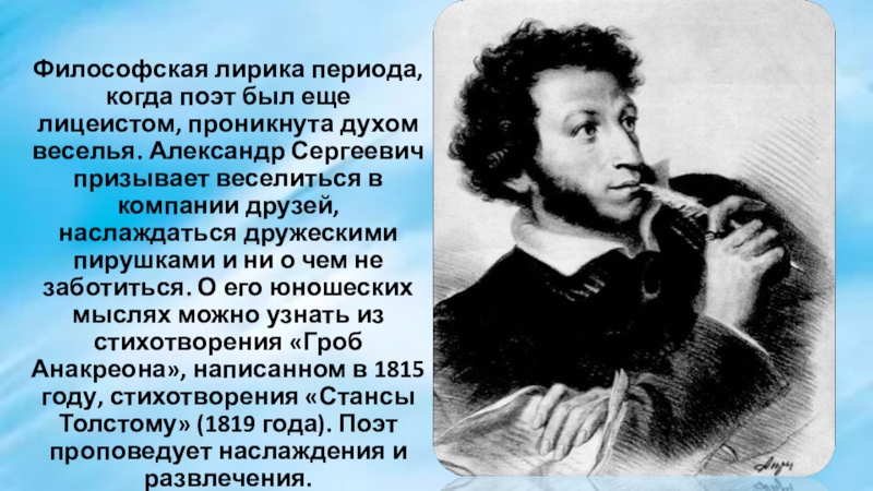 Слайд 5Философская лирика периода, когда поэт был еще лицеистом, проникнута духом веселья.