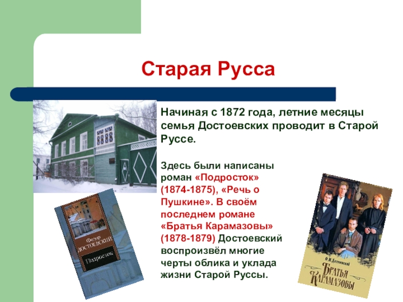 Здесь были написаны роман «Подросток»(1874-1875), «Речь о Пушкине». В своём последнем романе «Братья Карамазовы»(1878-1879) Достоевский воспроизвёл многие черты облика и уклада жизни Старой Руссы.