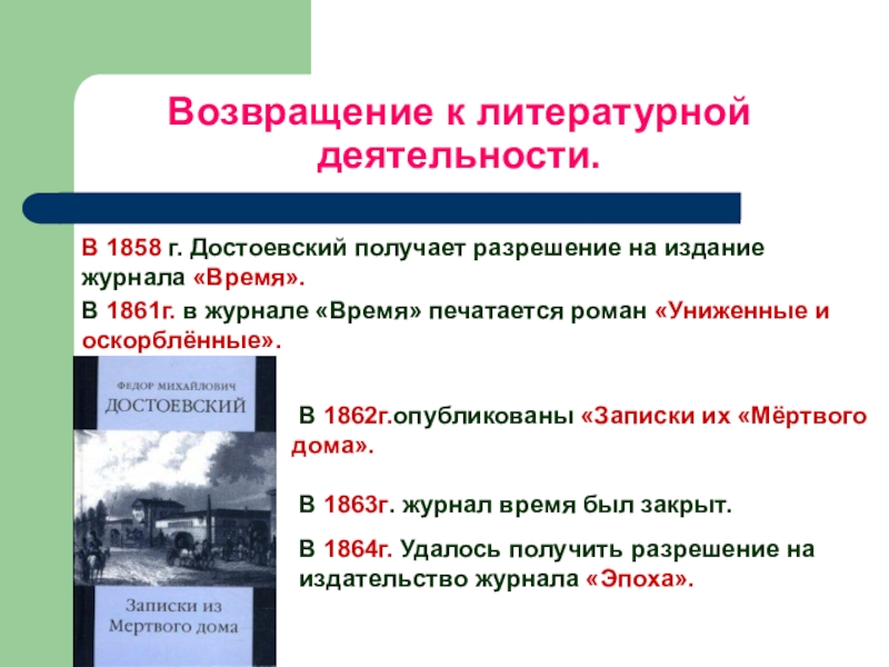 В 1864г. Удалось получить разрешение на издательство журнала «Эпоха».
