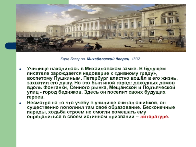 зарождается недоверие к «дивному граду», воспетому Пушкиным. Петербург властно вошёл в его жизнь, захватил его душу. Но это был иной город: доходных домов вдоль Фонтанки, Сенного рынка, Мещанской и Подъяческой улиц - город бедняков. Здесь он поселит своих будущих героев.