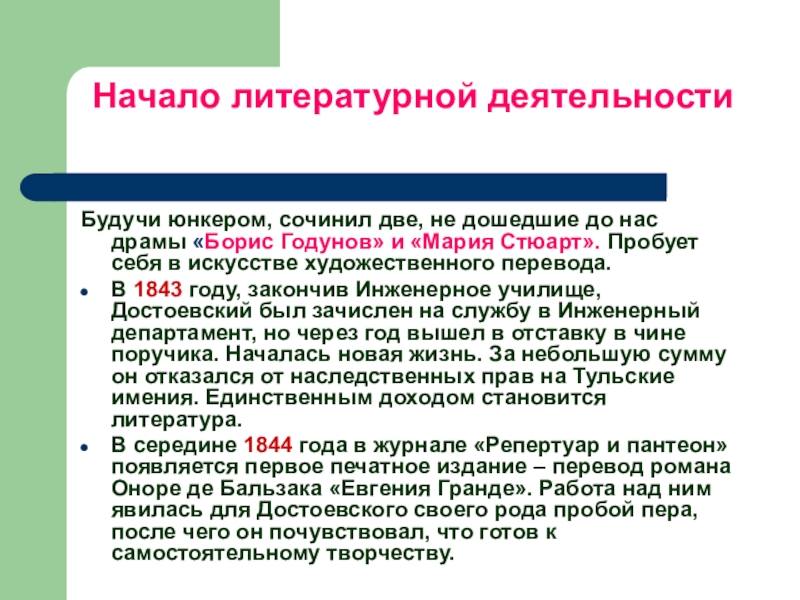 В середине 1844 года в журнале «Репертуар и пантеон» появляется первое печатное издание – перевод романа Оноре де Бальзака «Евгения Гранде». Работа над ним явилась для Достоевского своего рода пробой пера, после чего он почувствовал, что готов к самостоятельному творчеству.