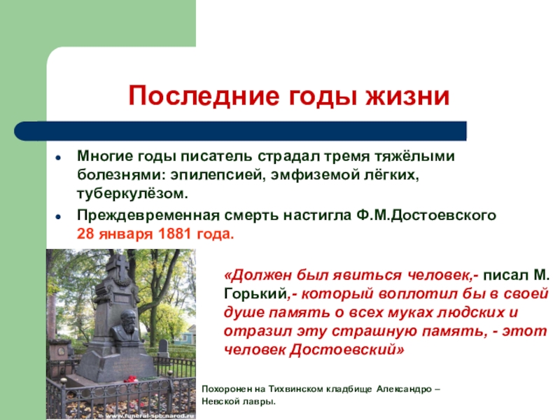 Преждевременная смерть настигла Ф.М.Достоевского 28 января 1881 года.