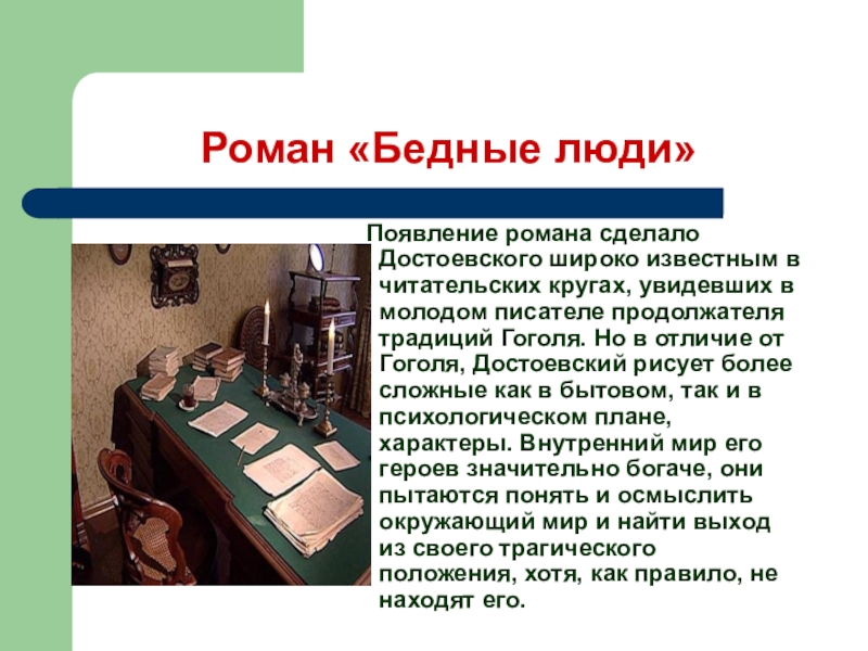 читательских кругах, увидевших в молодом писателе продолжателя традиций Гоголя. Но в отличие от Гоголя, Достоевский рисует более сложные как в бытовом, так и в психологическом плане, характеры. Внутренний мир его героев значительно богаче, они пытаются понять и осмыслить окружающий мир и найти выход из своего трагического положения, хотя, как правило, не находят его.