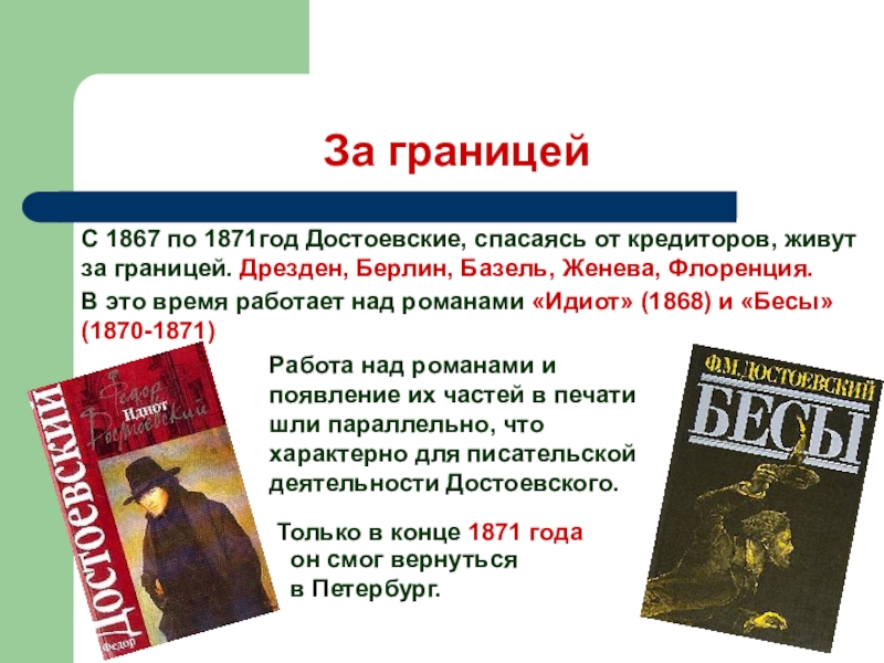 В это время работает над романами «Идиот» (1868) и «Бесы» (1870-1871)