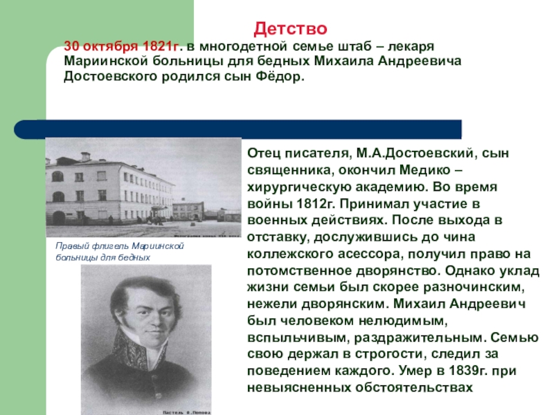 30 октября 1821г. в многодетной семье штаб – лекаря Мариинской больницы для бедных Михаила Андреевича Достоевского родился сын Фёдор.