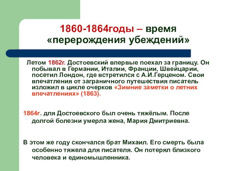 границу. Он побывал в Германии, Италии, Франции, Швейцарии, посетил Лондон, где встретился с А.И.Герценом. Свои впечатления от заграничного путешествия писатель изложил в цикле очерков «Зимние заметки о летних впечатлениях» (1863).