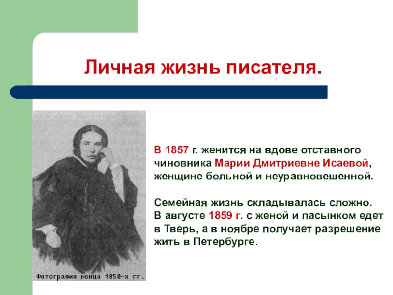 1864г. для Достоевского был очень тяжёлым. После долгой болезни умерла жена, Мария Дмитриевна.