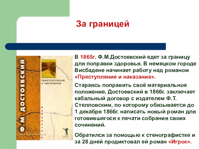 Стараясь поправить своё материальное положение, Достоевский в 1866г. заключает кабальный договор с издателем Ф.Т.Стелловским, по которому обязывается до 1 декабря 1866г. написать новый роман для готовившегося к печати собрания своих сочинений.