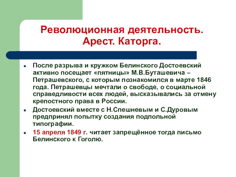 15 апреля 1849 г. читает запрещённое тогда письмо Белинского к Гоголю.