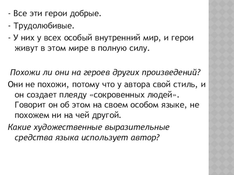 Они не похожи, потому что у автора свой стиль, и он создает плеяду «сокровенных людей». Говорит он об этом на своем особом языке, не похожем ни на чей другой.