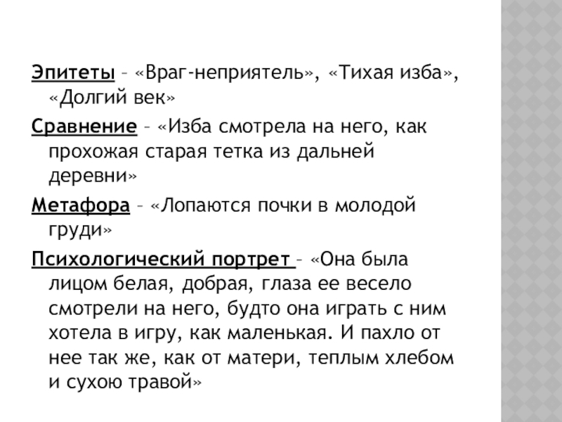 Психологический портрет – «Она была лицом белая, добрая, глаза ее весело смотрели на него, будто она играть с ним хотела в игру, как маленькая. И пахло от нее так же, как от матери, теплым хлебом и сухою травой»