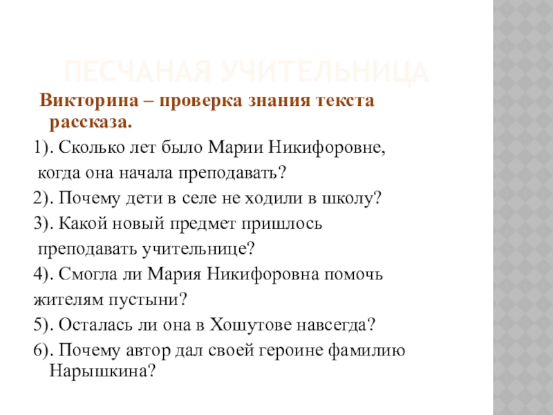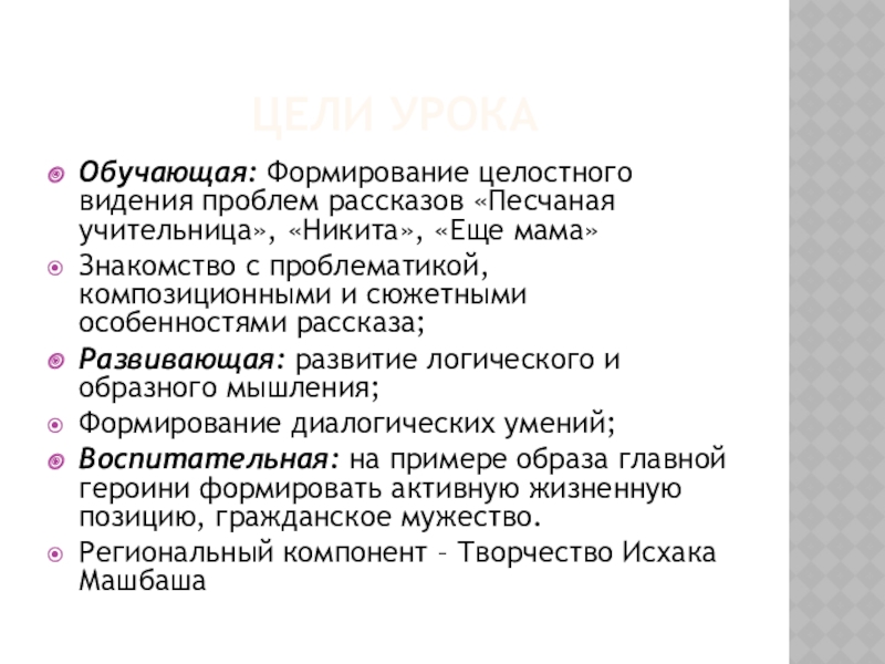 Обучающая: Формирование целостного видения проблем рассказов «Песчаная учительница», «Никита», «Еще