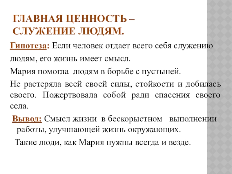 Вывод: Смысл жизни в бескорыстном выполнении работы, улучшающей жизнь окружающих.