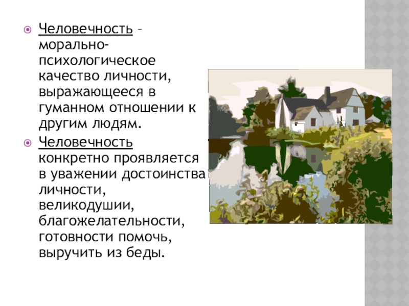 Слайд 3Человечность – морально-психологическое качество личности, выражающееся в гуманном отношении к другим