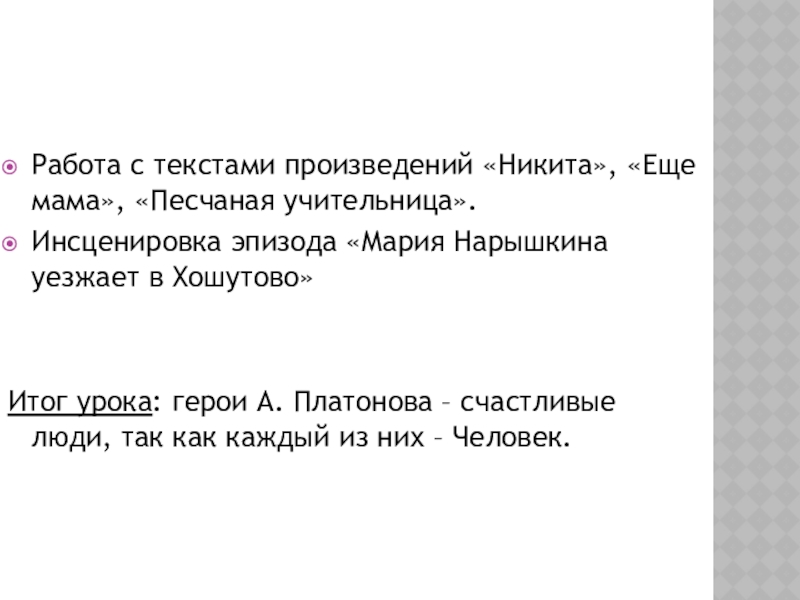 Итог урока: герои А. Платонова – счастливые люди, так как каждый из них – Человек.