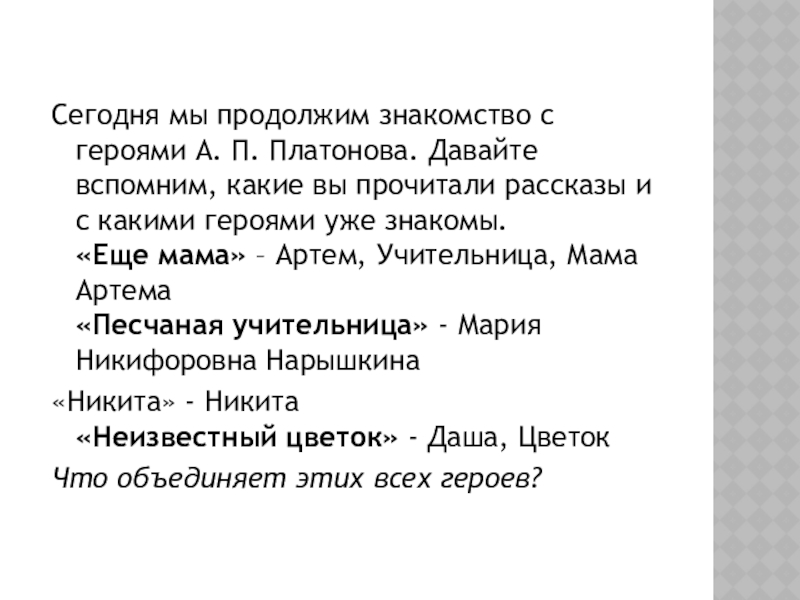 Слайд 5Сегодня мы продолжим знакомство с героями А. П. Платонова. Давайте вспомним,