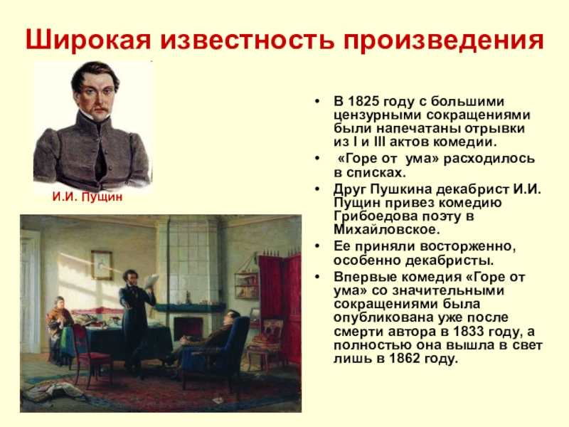 Друг Пушкина декабрист И.И. Пущин привез комедию Грибоедова поэту в Михайловское.