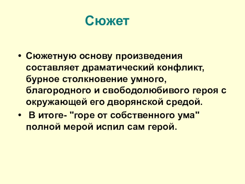 Сюжетную основу произведения составляет драматический конфликт, бурное столкновение умного, благородного и