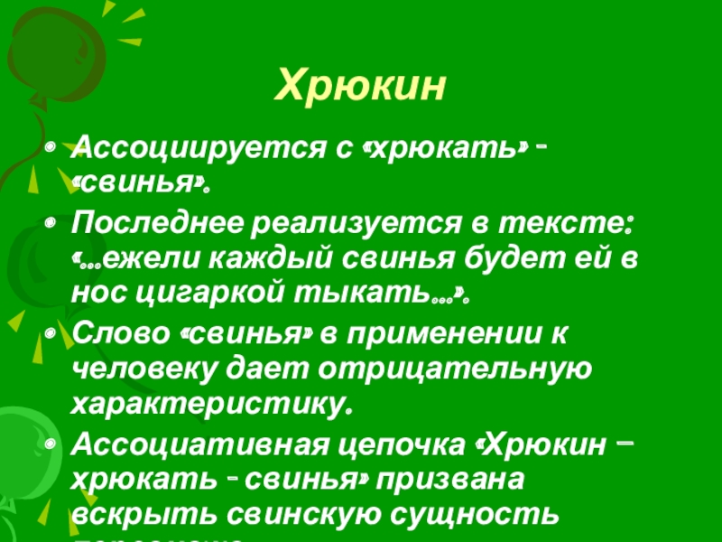 Ассоциативная цепочка «Хрюкин – хрюкать - свинья» призвана вскрыть свинскую сущность персонажа.