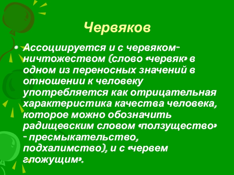 в отношении к человеку употребляется как отрицательная характеристика качества человека, которое можно обозначить радищевским словом «ползущество» - пресмыкательство, подхалимство), и с «червем гложущим».