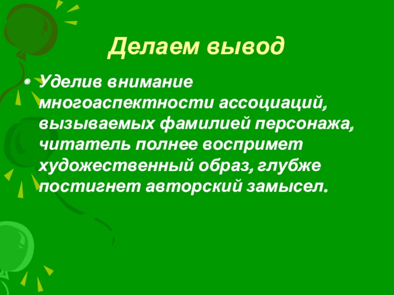Исходя из этого, мы предлагаем найти в тексте произведения ассоциативно связанные с фамилией персонажа слова и с их помощью составить и дорисовать словесный портрет персонажа.
