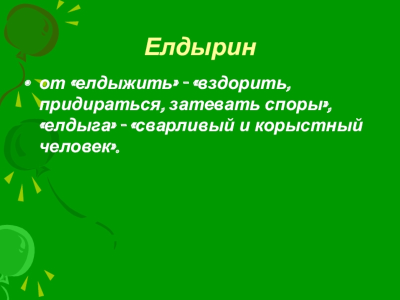 от «елдыжить» - «вздорить, придираться, затевать споры», «елдыга» - «сварливый и