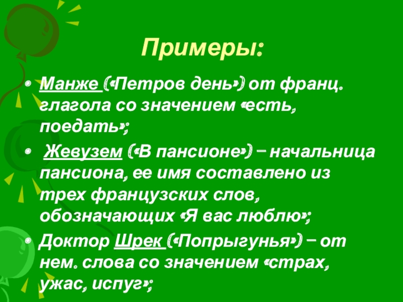 Манже («Петров день») от франц. глагола со значением «есть, поедать»;