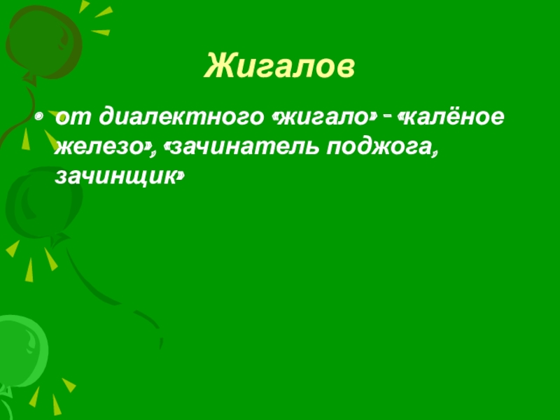 от диалектного «жигало» - «калёное железо», «зачинатель поджога, зачинщик»