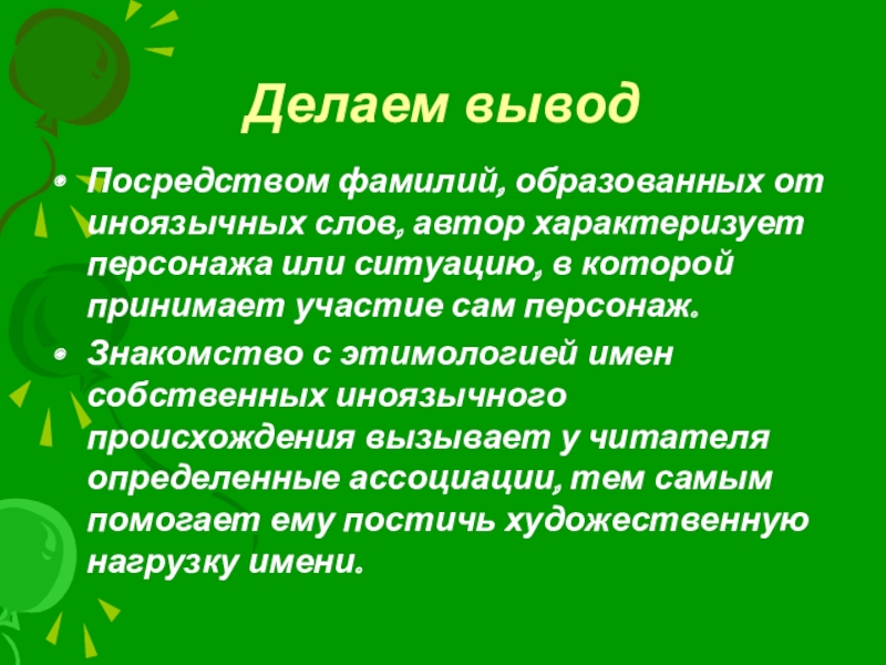 Посредством фамилий, образованных от иноязычных слов, автор характеризует персонажа или