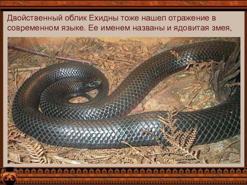 Слайд 37Двойственный облик Ехидны тоже нашел отражение в современном языке. Ее именем