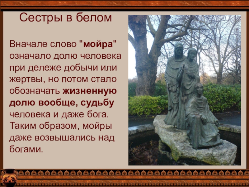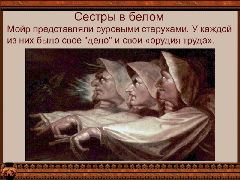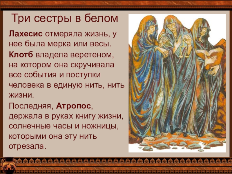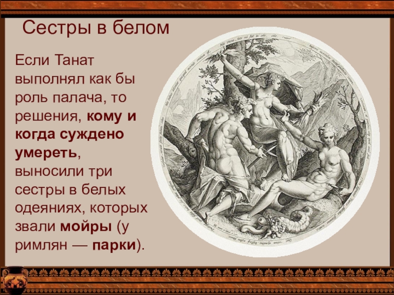кому и когда суждено умереть, выносили три сестры в белых одеяниях, которых звали мойры (у римлян — парки).
