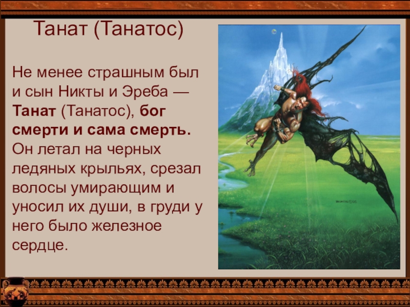Танат (Танатос), бог смерти и сама смерть. Он летал на черных ледяных крыльях, срезал волосы умирающим и уносил их души, в груди у него было железное сердце.