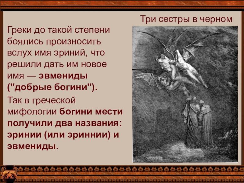 Так в греческой мифологии богини мести получили два названия: эринии (или эриннии) и эвмениды.