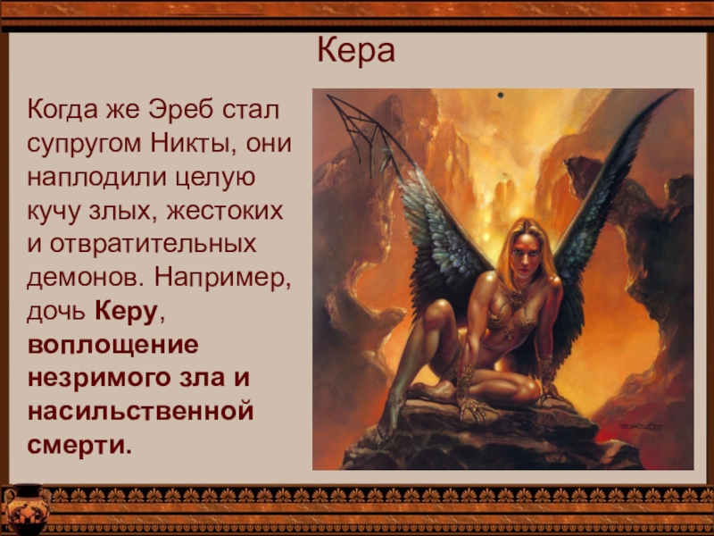 злых, жестоких и отвратительных демонов. Например, дочь Керу, воплощение незримого зла и насильственной смерти.