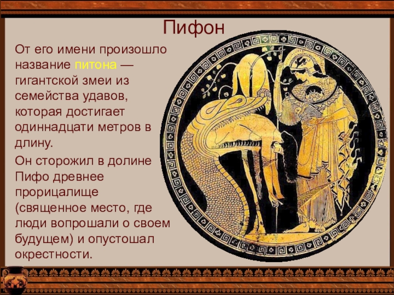 Он сторожил в долине Пифо древнее прорицалище (священное место, где люди вопрошали о своем будущем) и опустошал окрестности.