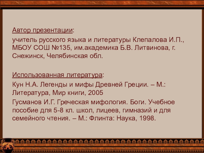 Гусманов И.Г. Греческая мифология. Боги. Учебное пособие для 5-8 кл. школ, лицеев, гимназий и для семейного чтения. – М.: Флинта: Наука, 1998.